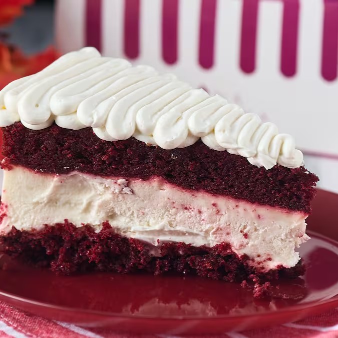 Generosa fatia de massa de Cacau Vermelho, com uma super camada de mousse de cream cheese. Coberto por mousse de cream cheese.