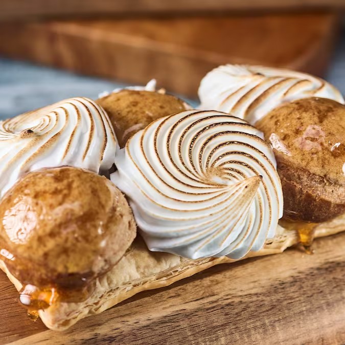 Doce francês, feito com massa folhada, com carolinas recheadas com creme patissier aveludado coberto com caramelo crocante, e merengue italiano.