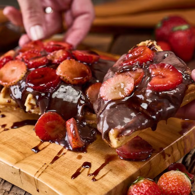Massa de waffle, crocante por fora e macia por dentro, coberta por brigadeiro belga e morangos frescos!