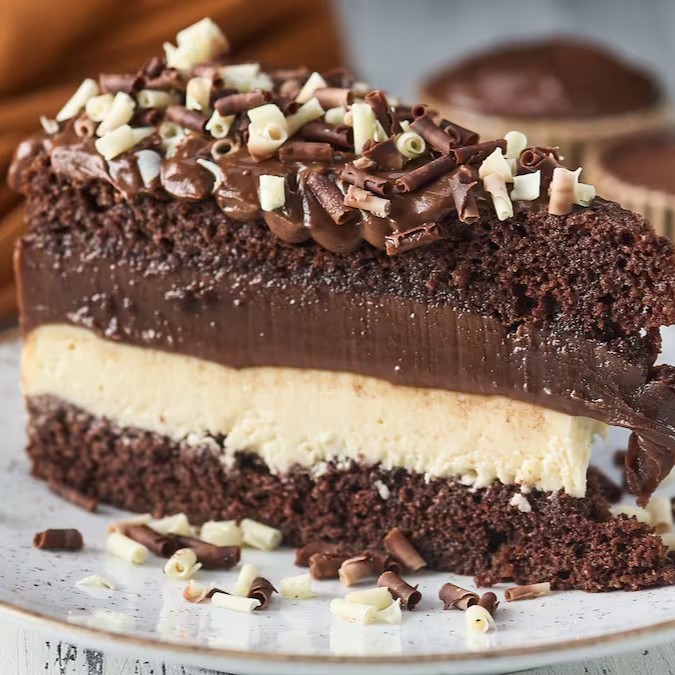 Fatia generosa de massa de chocolate fofinha e molhadinha, recheada com uma camada de Mousse de Ninho e outra camada de um cremoso brigadeiro gourmet de Nutella, coberto com uma ganache de chocolate nobre incrivelmente aveludada!