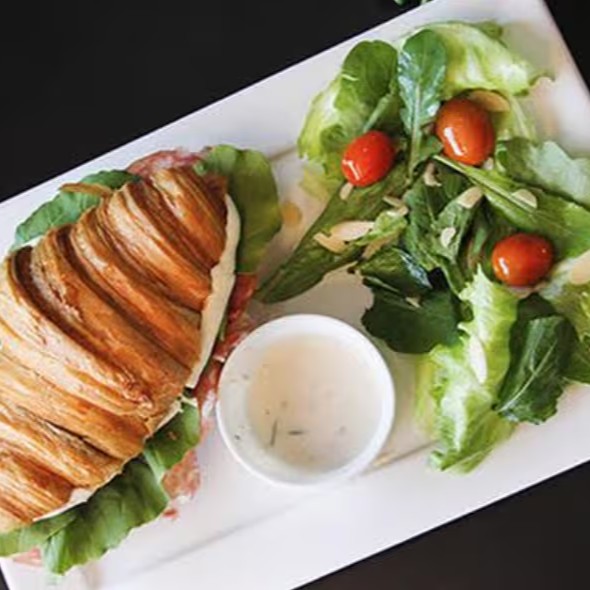 Croissant produzido com farinha especial, recheado com salame e rúcula, tomate confit e cream cheese. Com Salada de rúcula com alface americana, tomate, amêndoas laminadas e molho da casa.