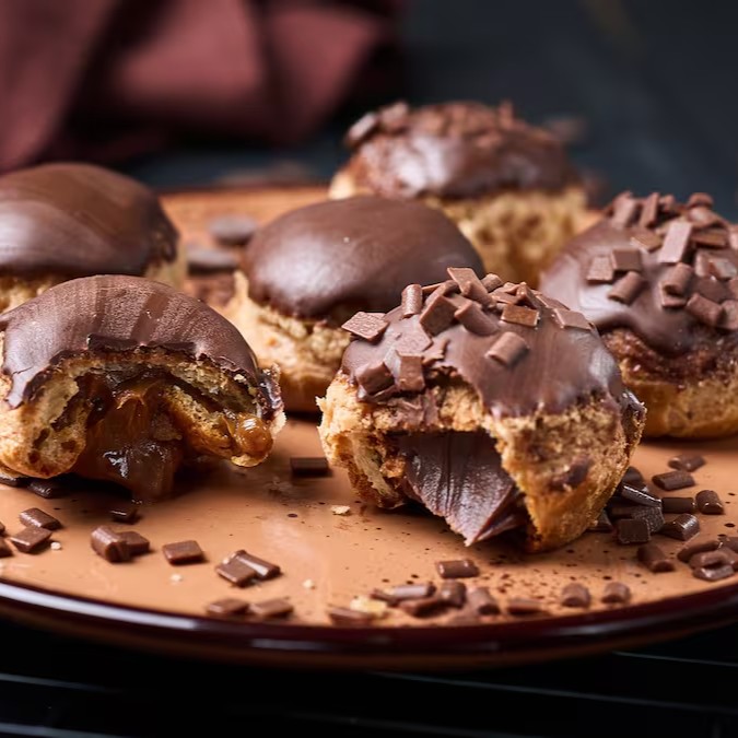 Deliciosa carolina recheada de doce de leite, coberta com chocolate.