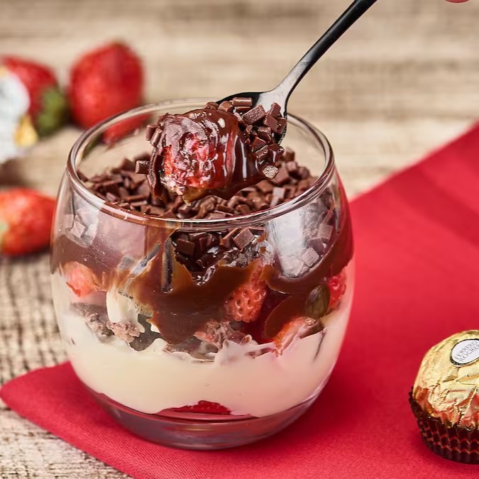 Morangos frescos, com um delicioso brigadeiro de leite condensado cremoso, ferrero rocher, coberto por uma ganache de chocolate meio amargo e splits callebaut.
