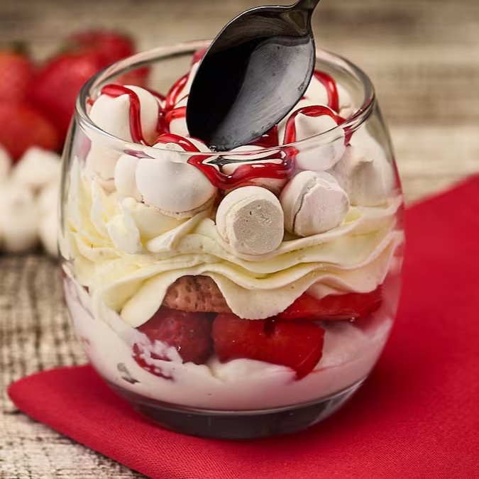 Creme pâtisserie aveludado, morangos selecionados e frescos, coberto por chantilly, suspiros e calda de morango.