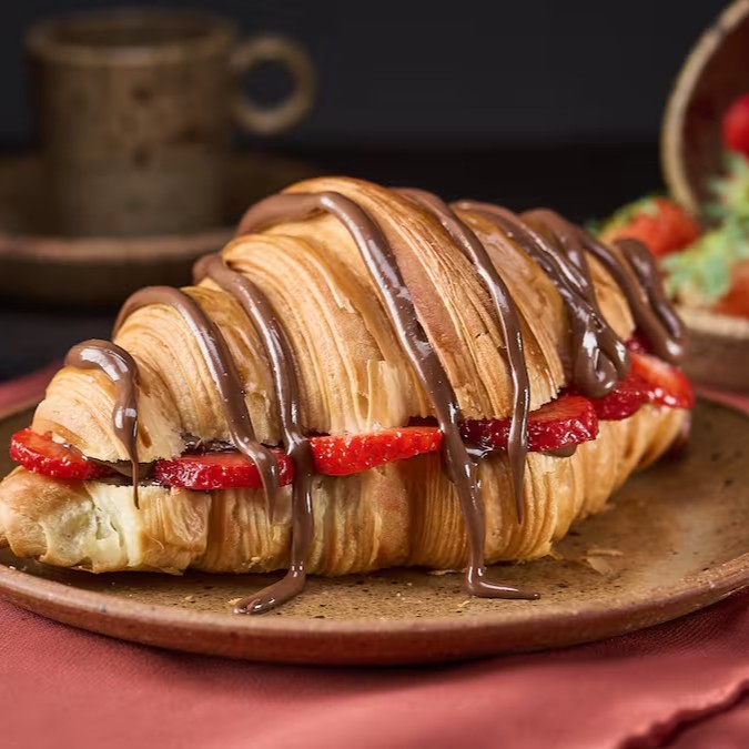 Croissant amanteigado Original da frança recheado com Nutella e morangos.