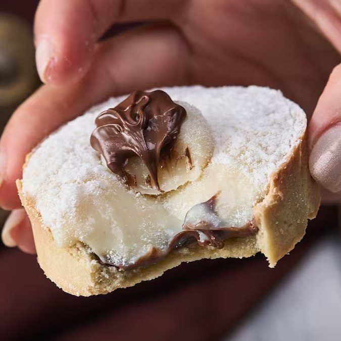 Massa patê sucrê, recheado de pura Nutella, brigadeiro de leite Ninho cremoso e salpicado com leite Ninho, e ainda vem premiada com um delicioso brigadeiro por cima