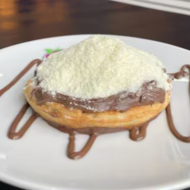 Waffle crocante, doce de leite, banana, cobertura de doce de leite, chantilly e canela.
