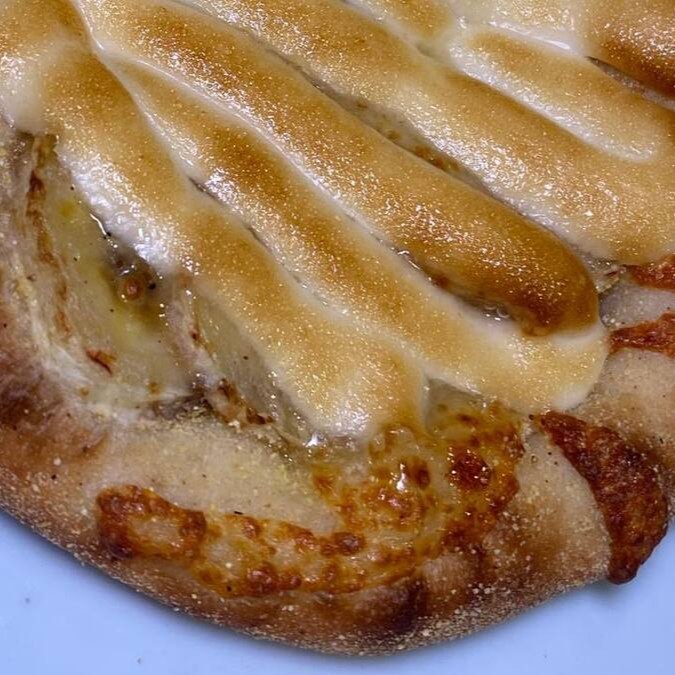 Massa de esfiha com fubá, mussarela, banana fatiada e chocolate branco flambado