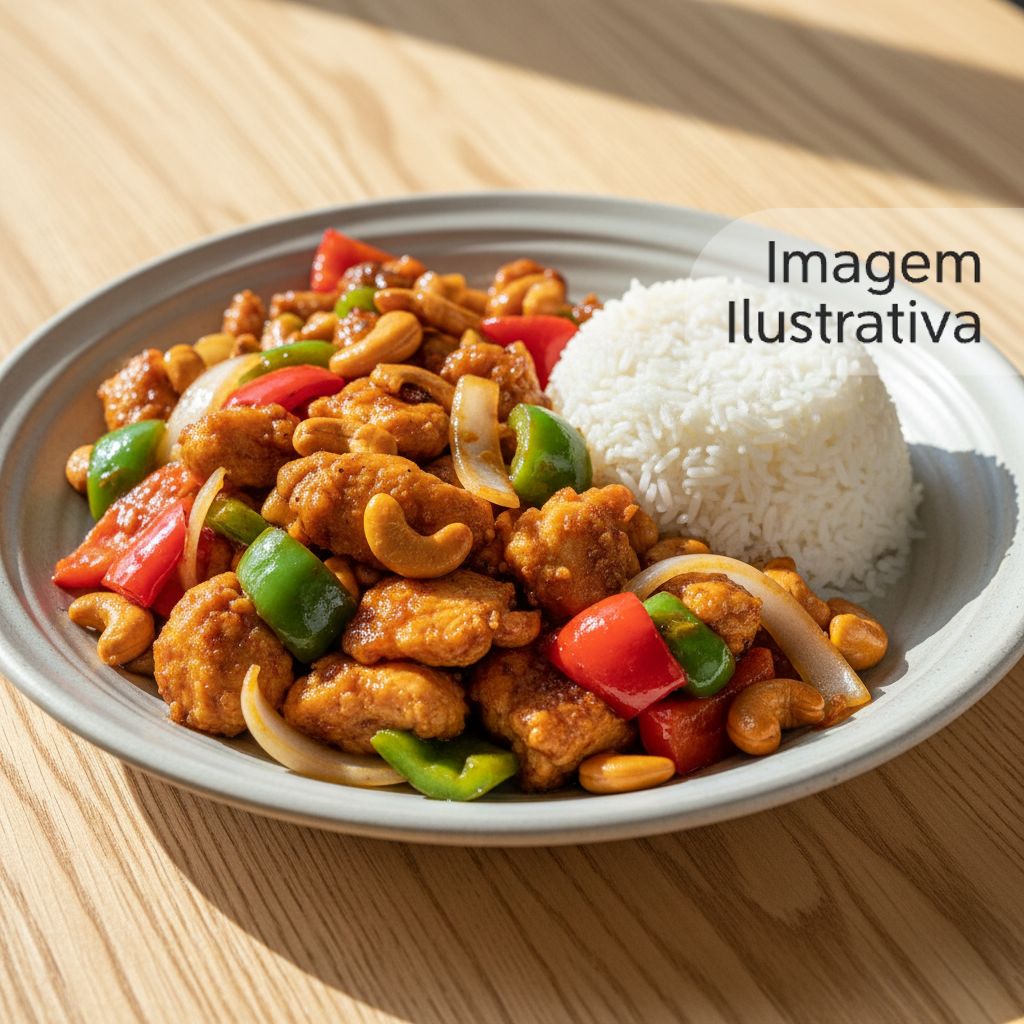 Frango Xadrez com um toque picante, preparado com pimentas vermelhas, pimentões, cebola e castanhas.