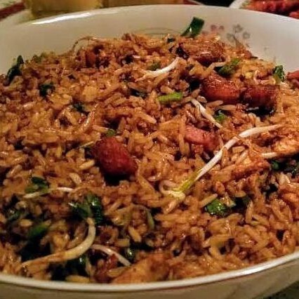 Arroz Frito no wok com ovo, presunto, frango e porco.
