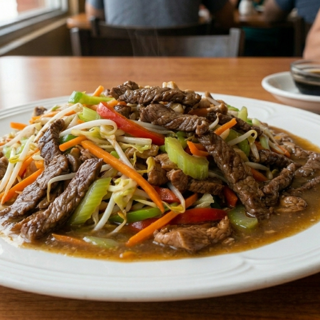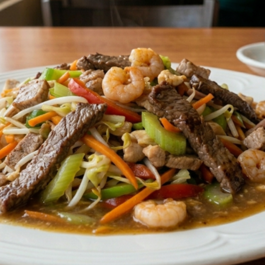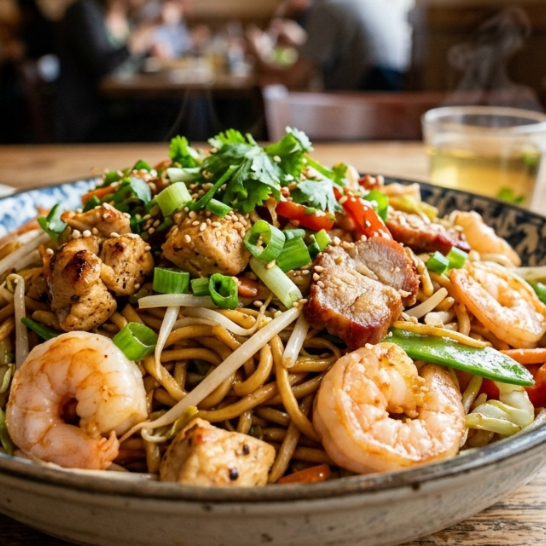 Macarrão frito no wok com legumes, presunto, frango, porco e camarão.
