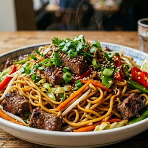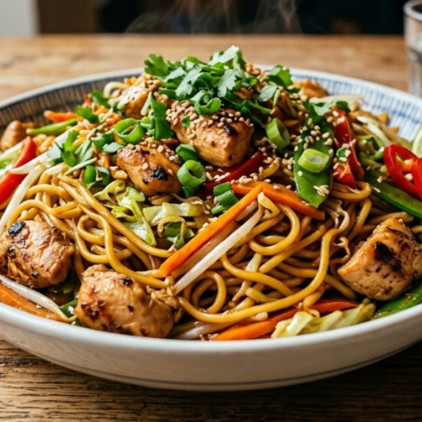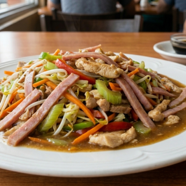 Macarrão frito no wok com legumes, presunto e carne de porco.