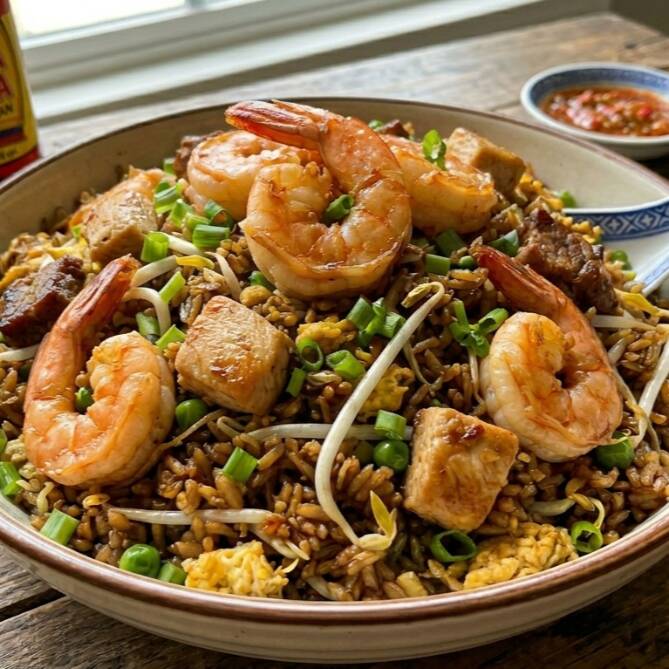 Arroz frito no wok com ovo, presunto, frango, carne de porco e camarão.