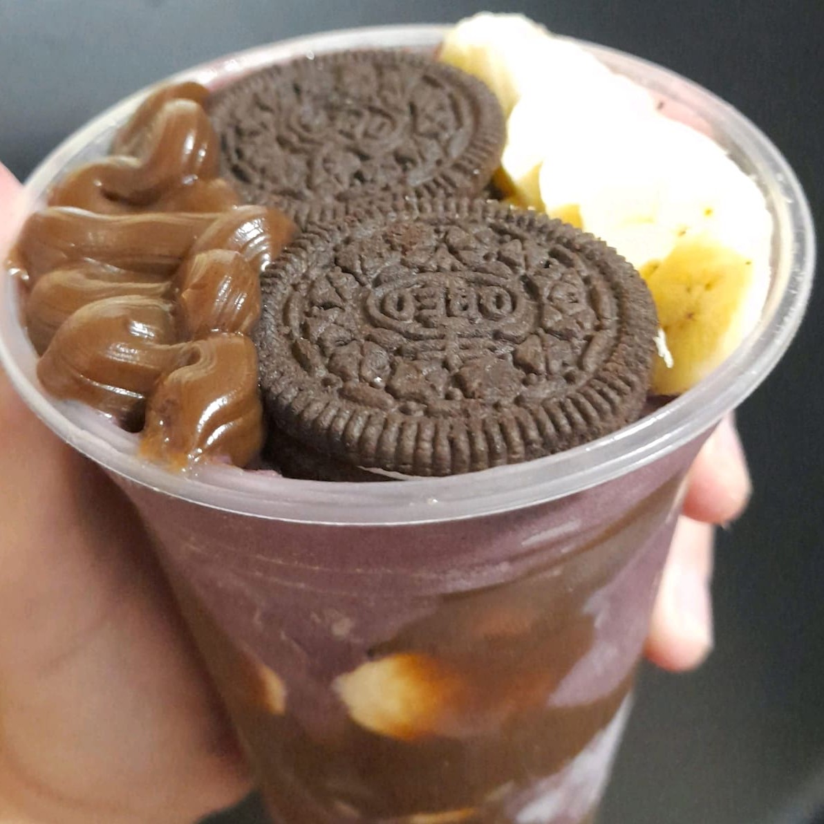 Açaí + creme de chocolate ( branco ou preto ) + Oreo triturado + choco ball + leite condensado