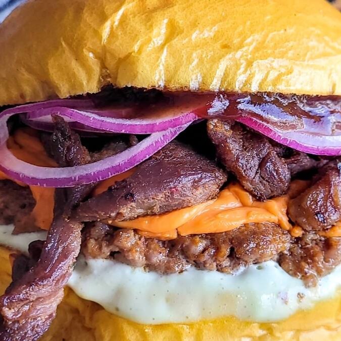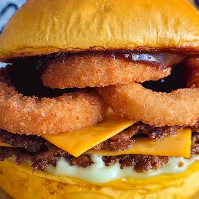 Delicie-se com pão brioche macio, recheado com 2 hambúrgueres artesanais de 40g cada, 2 fatias de queijo cheddar derretido, maionese cremosa e um toque de molho barbecue e Para completar 3 anéis de cebola empanados super saborosos. Uma explosão de sabor em cada mordida!