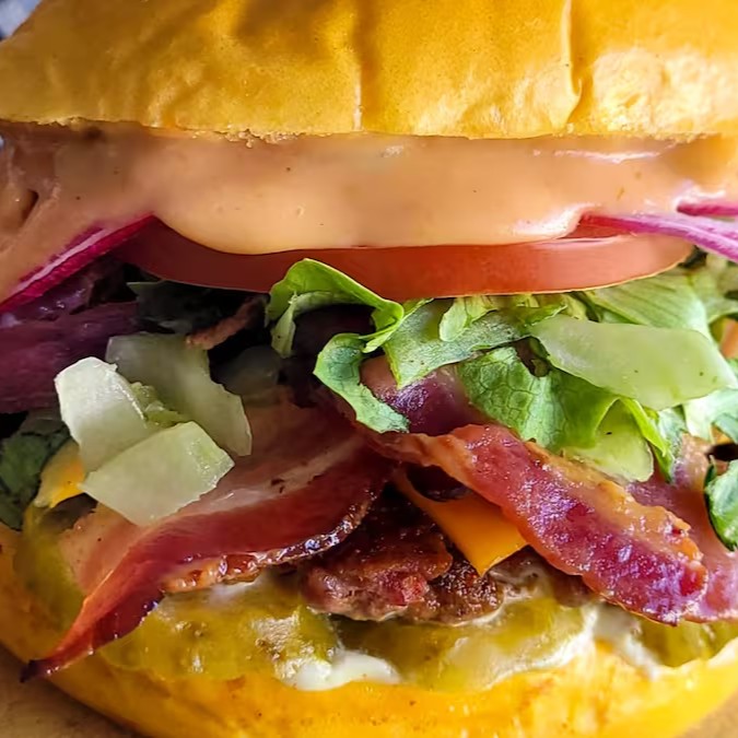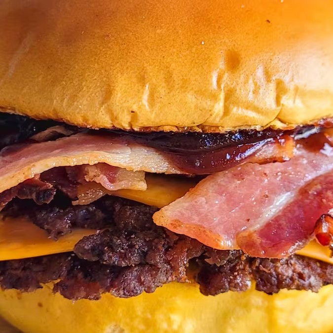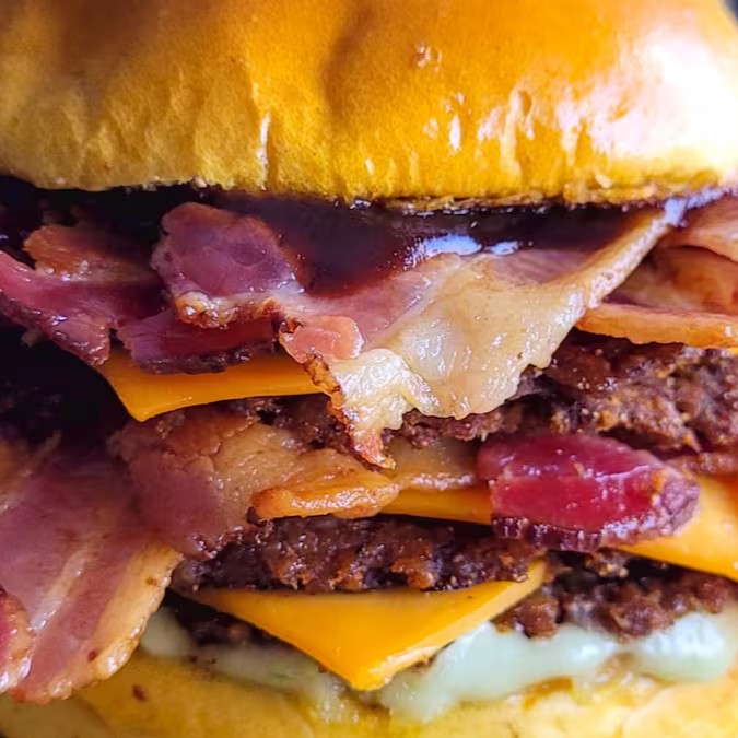 Deixe-se envolver por um pão brioche macio, recheado com 2 hambúrgueres artesanais de 40g cada, 2 fatias de queijo cheddar derretido, bacon crocante em fatias, maionese cremosa e um toque irresistível de molho barbecue. Uma combinação perfeita que vai conquistar seu paladar a cada mordida!