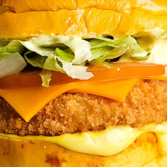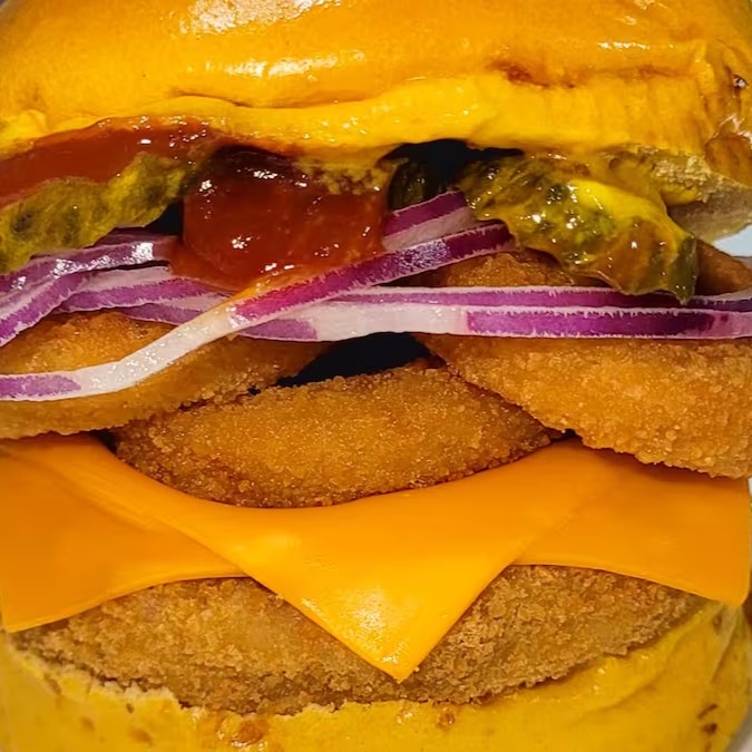 Uma combinação de crocância e sabor em cada mordida! Pão brioche macio, hambúrguer de frango empanado douradinho, duas fatias de cheddar derretido, três onion rings crocantes, cebola roxa, pickles agridoce e o equilíbrio perfeito de ketchup e mostarda
