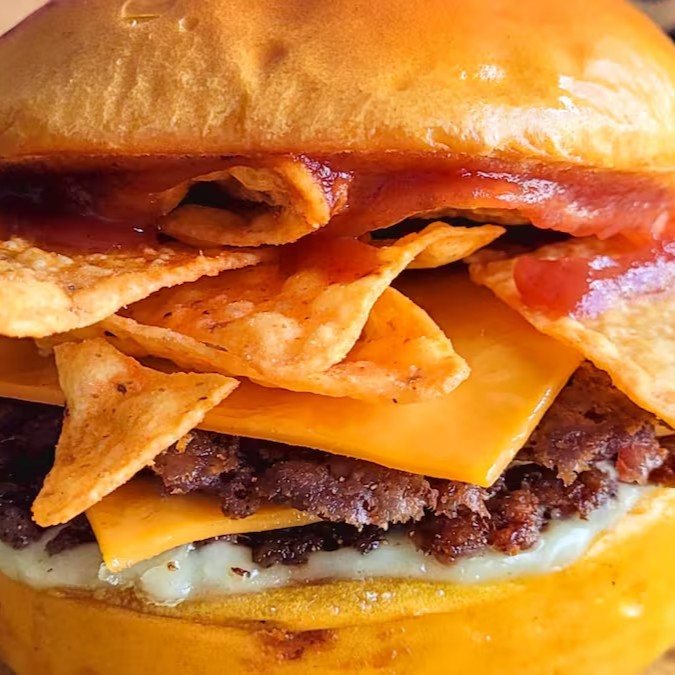 Experimente uma explosão de sabor com o nosso irresistível pão brioche, macio e dourado, recheado com dois hambúrgueres artesanais suculentos de 40g cada. Entre os hambúrgueres, derretem-se duas fatias generosas de queijo cheddar, criando uma combinação cremosa e saborosa. Finalizamos com uma camada de maionese cremosa, um toque de ketchup e o crunch irresistível do Doritos, garantindo uma mordida cheia de texturas e sabores inesquecíveis. Uma verdadeira festa para o seu paladar!
