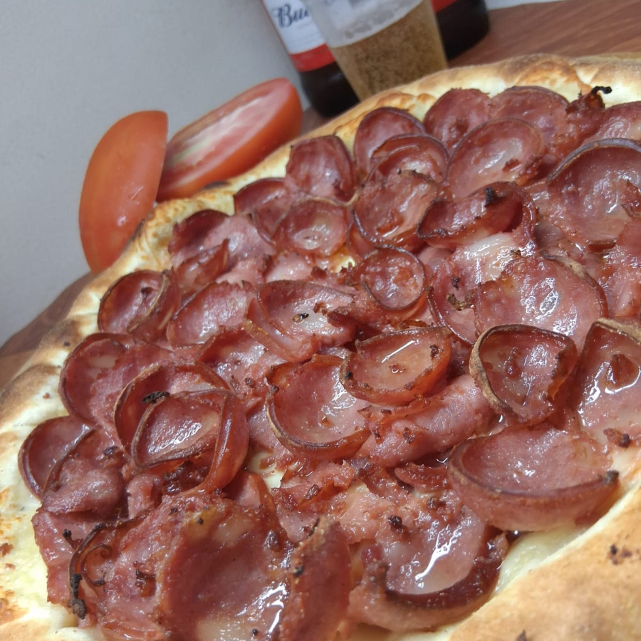 Molho, calabresa, cebola, ovos, bacon, queijo por cima e orégano