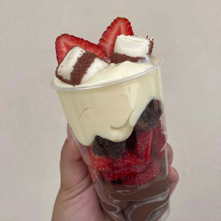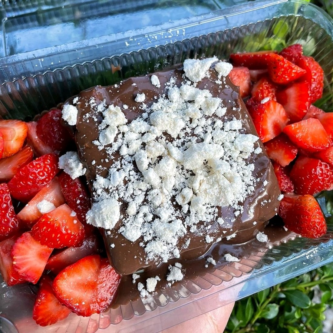 Brownie macio e molhadinho, recheado com o creme de sua preferência, coberto com ganache e granulado, acompanhado de morangos frescos. Uma explosão de sabor que une o melhor do chocolate com o toque leve e azedinho da fruta.
