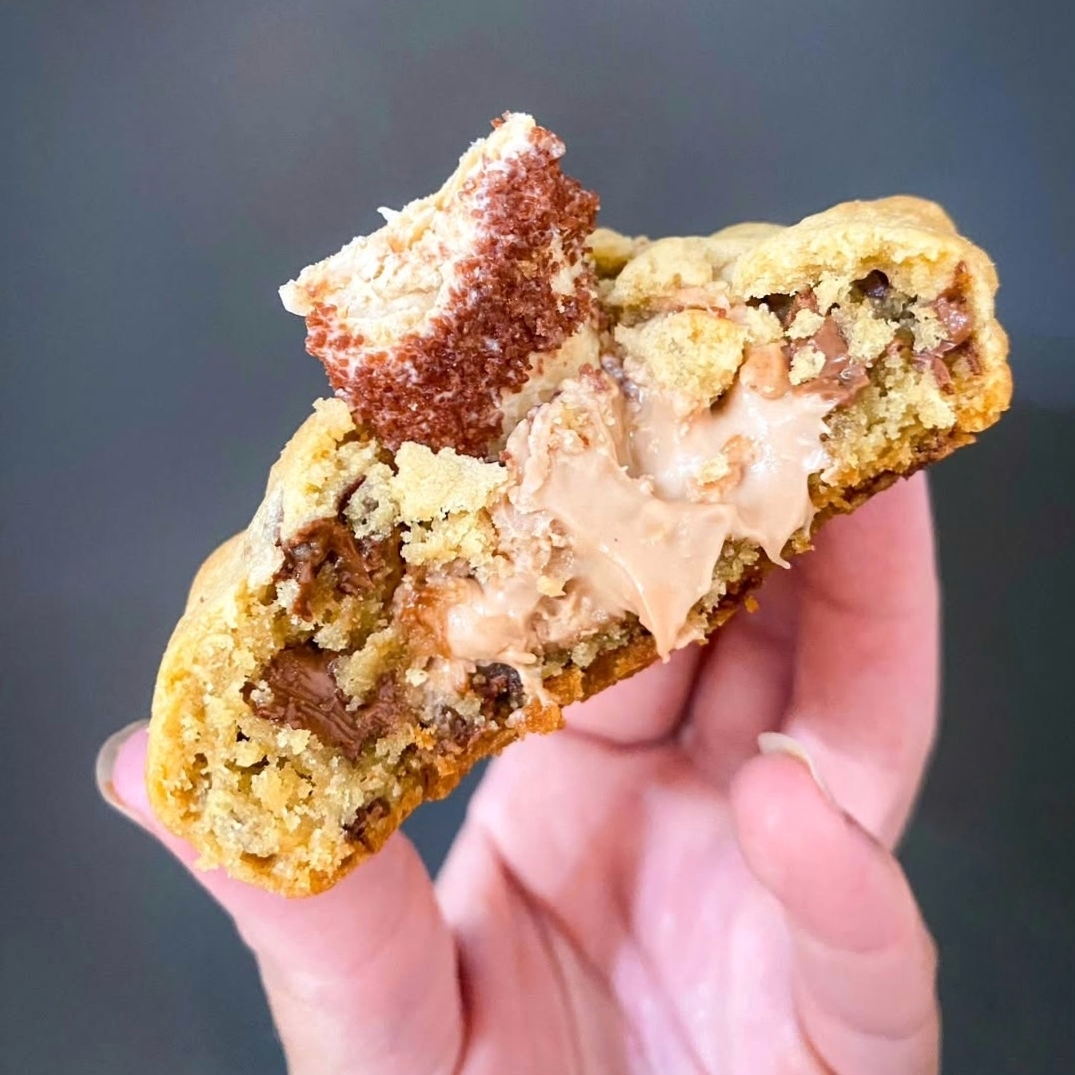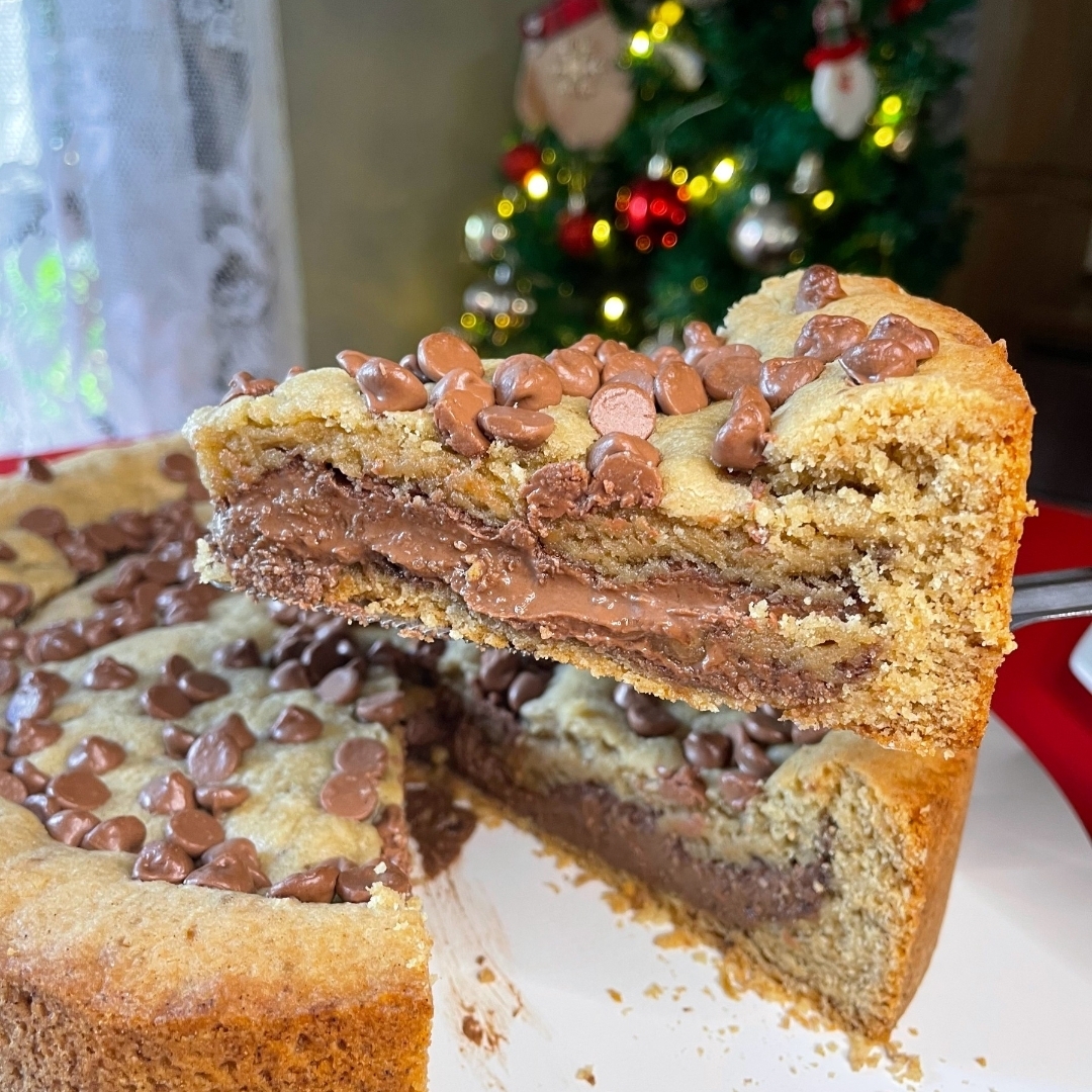 Fatia de cookie artesanal recheado com creme de avelã cremoso, que derrete a cada mordida. Finalizado com gotas de chocolate.