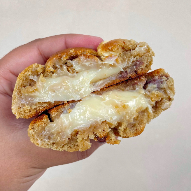 Um cookie irresistível, com uma massa amanteigada com gotas de chocolate ao leite e chocolate branco, recheado com um recheio cremoso inspirado no Kinder Bueno, finalizado com creme de avelã e Kinder Bueno.