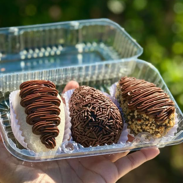 Uma combinação irresistível de brigadeiro de chocolate e brigadeiro branco, Ganache de chocolate blend, morangos frescos e uva Thompson, e claro nosso brownie tradicional em cubinhos.