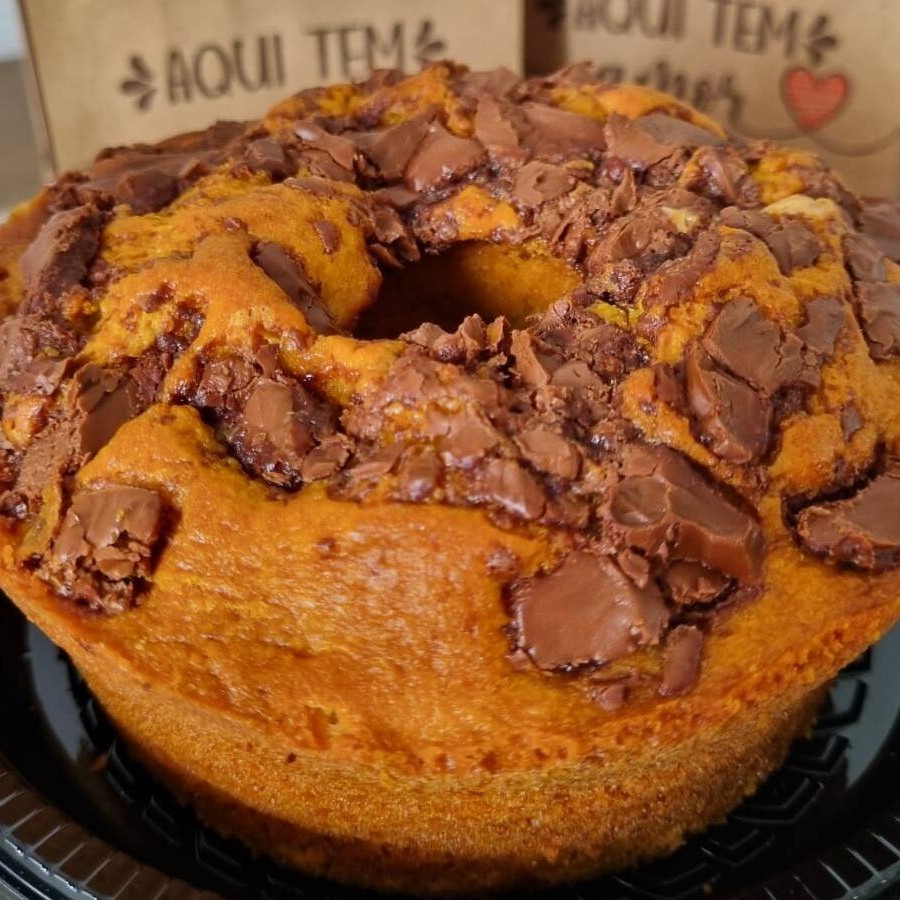 Bolo Caseiro saboroso com pedaços de chocolate ao leite na massa, ainda mais chocolatudo cheio de sabor, perfeito para qualquer momento Sem pré mistura ,não contem aromatizantes nem conservantes. Serve de 4 á 6 fatias.