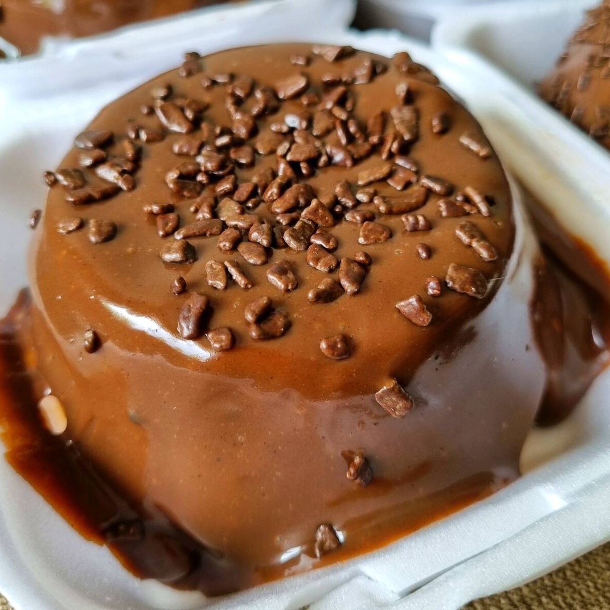 Mini bolo de chocolate fofinho, com cobertura cremosa de chocolate estilo vulcão. Ideal para um momento doce e irresistível.