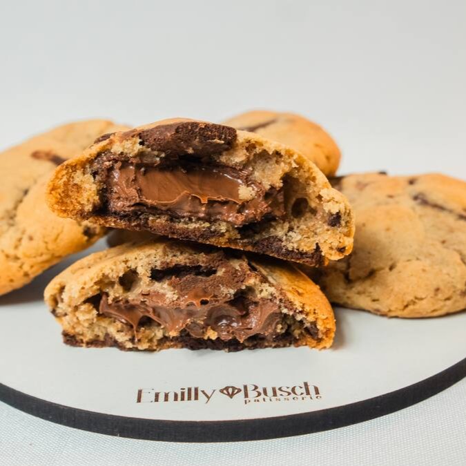 Massa de Cookie com gotas de chocolate ao leite e meio amargo recheado com Nutella pura.