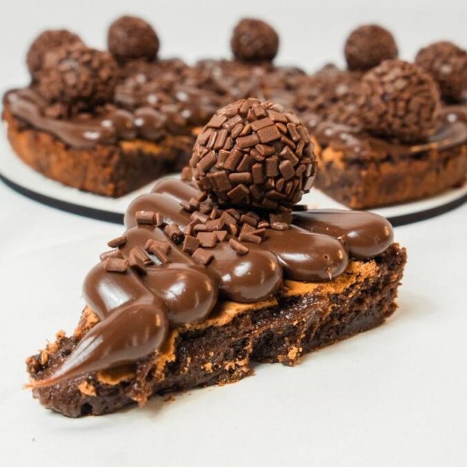 Fatia de brownie com cobertura de brigadeiro ao leite e um brigadeiro tradicional — Perfeito para os chocólatras de plantão!