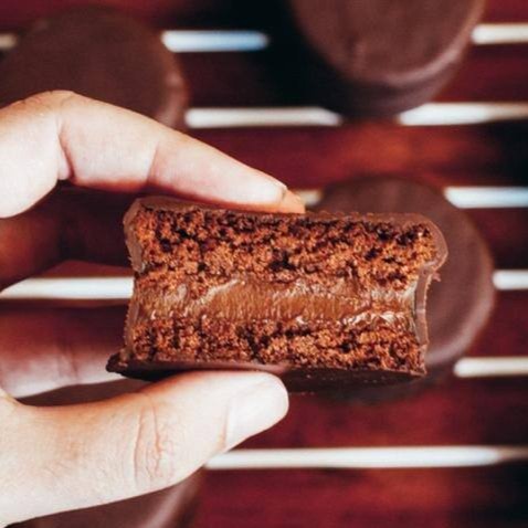 Biscoito de chocolate, com recheio de doce de leite e banhado no chocolate meio amargo