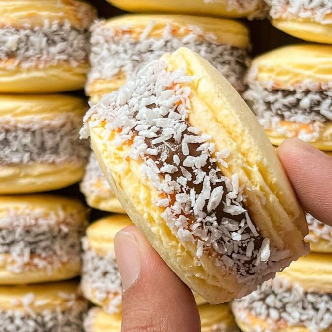 Biscoito de maisena, recheio de doce de leite e coco ralado ao redor do alfajor