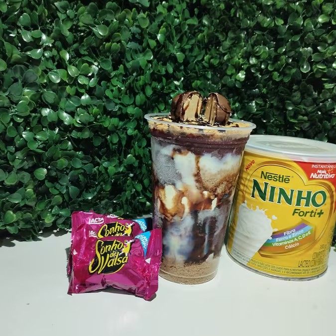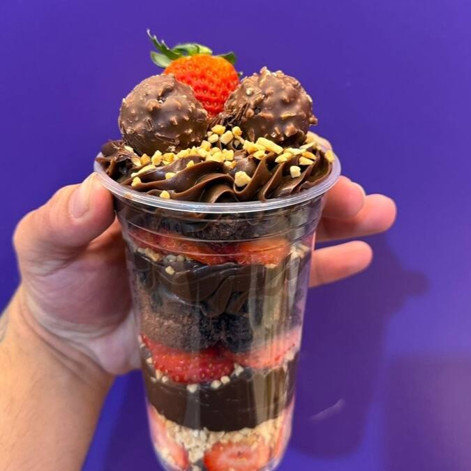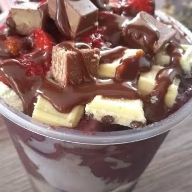 Copo de açaí com leite condensado, Paçoca, Calda de chocolate, Leite em pó e 1 Sonho de Valsa