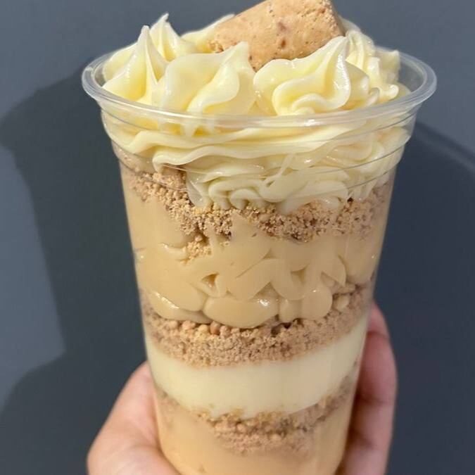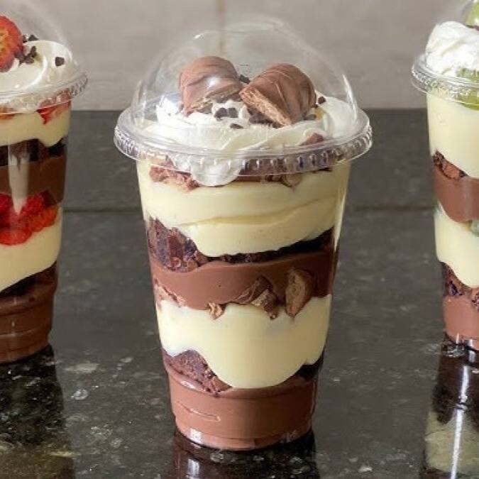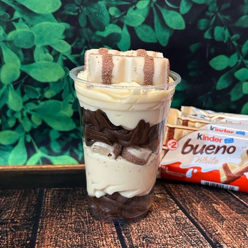 Acompanha camadas de creme de brigadeiro gourmet de Nutella, creme 4 leites e Kinder Bueno.
