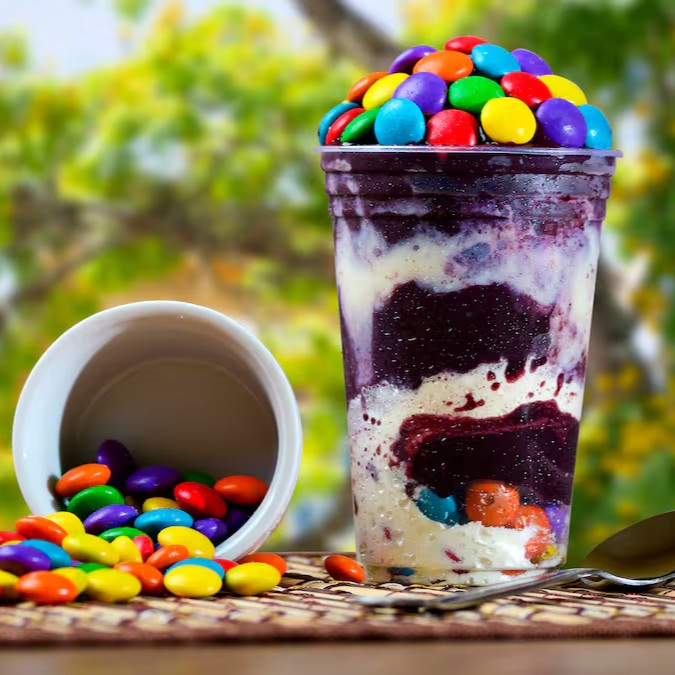 Açaí geladinho com leite condensado, Confete de chocolate ao leite colorido e balas de gomas.