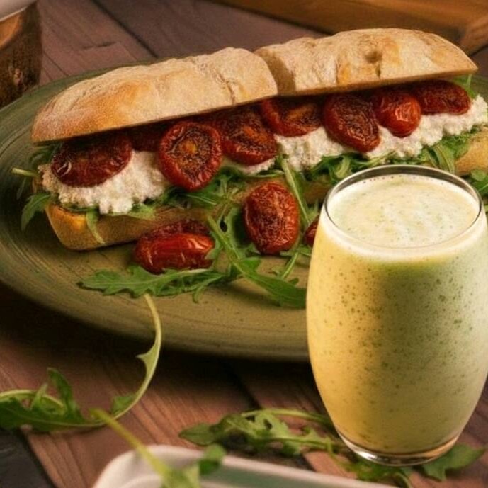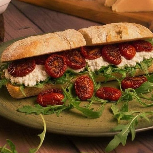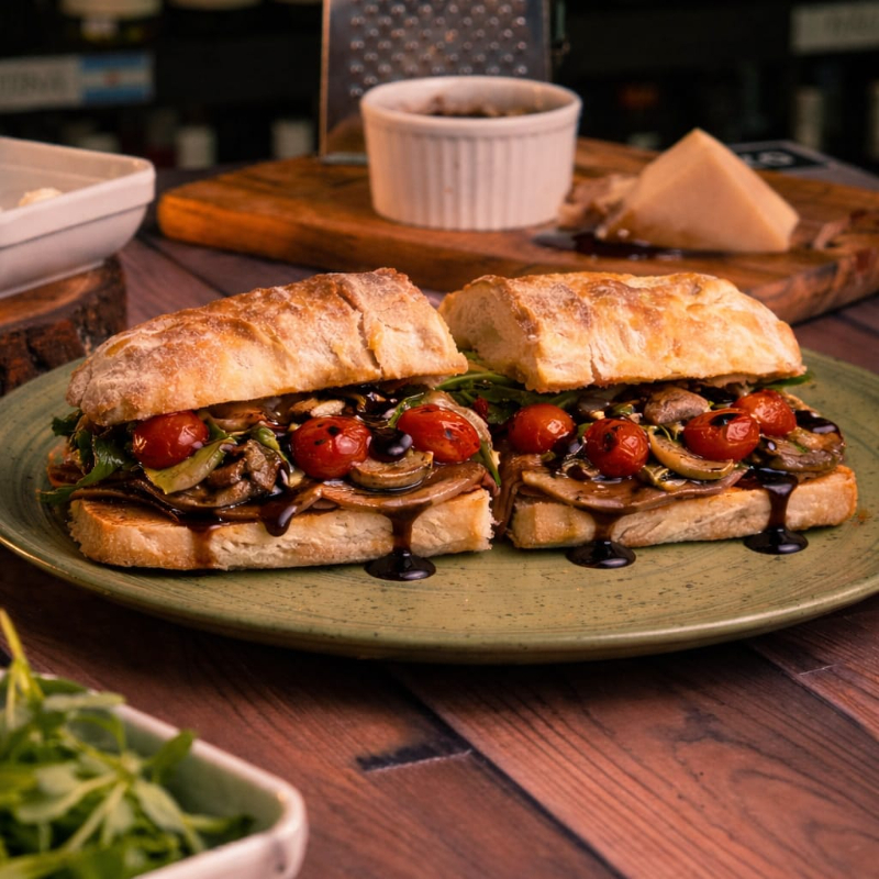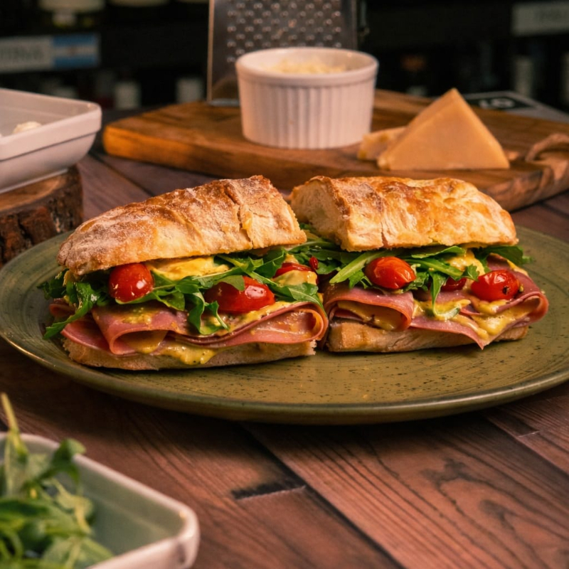 Ciabata levemente tostado, Mortadela Defumada, Rúcula, Tomatinhos cereja, e molho de Maionese e Mostarda.