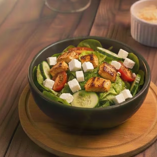 Frango grelhado, mix de folhas, tomate-cereja, pepino, queijo minas, azeite, limão e orégano.