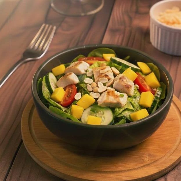 Frango grelhado, mix de folhas, manga, cenoura, amendoim torrado, molho cremoso de iogurte e mel.