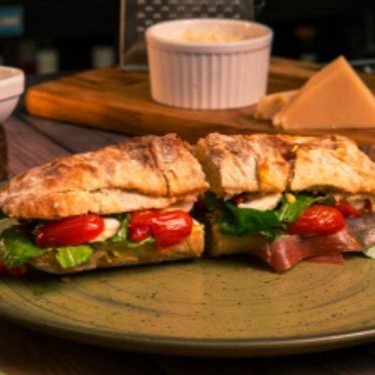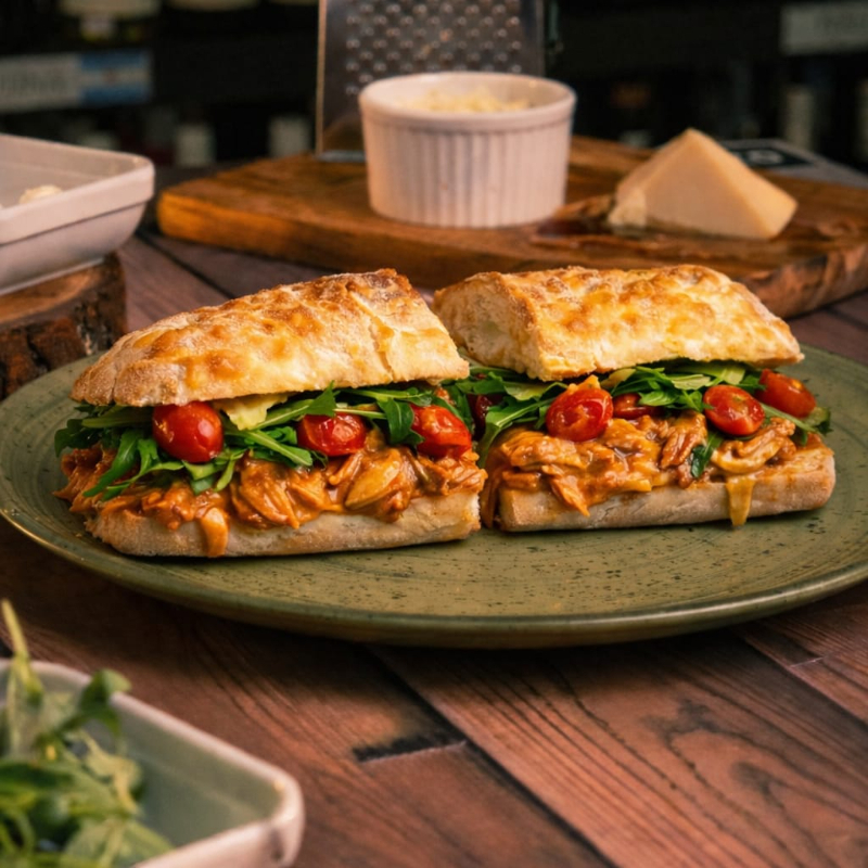 Ciabatta levemente tostado, Frango desfiado cremoso, Mussarela, tomate italiano, rucula.