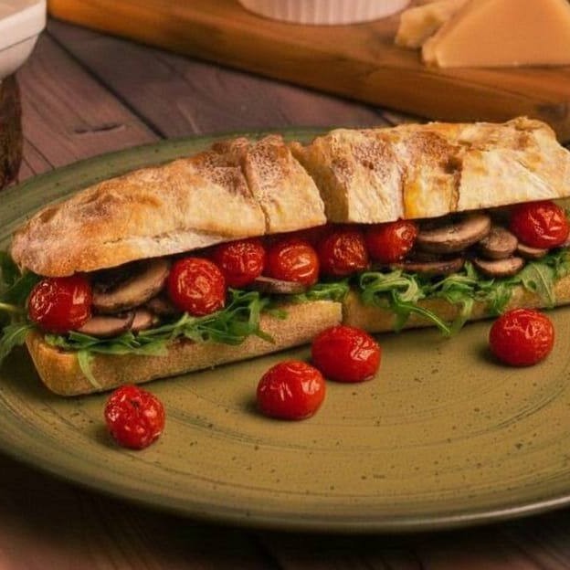 Ciabatta levemente tostado, abacate, creme de aceto balsâmico, mix de cogumelos, rucula, tomatinhos grape, páprica defumada.