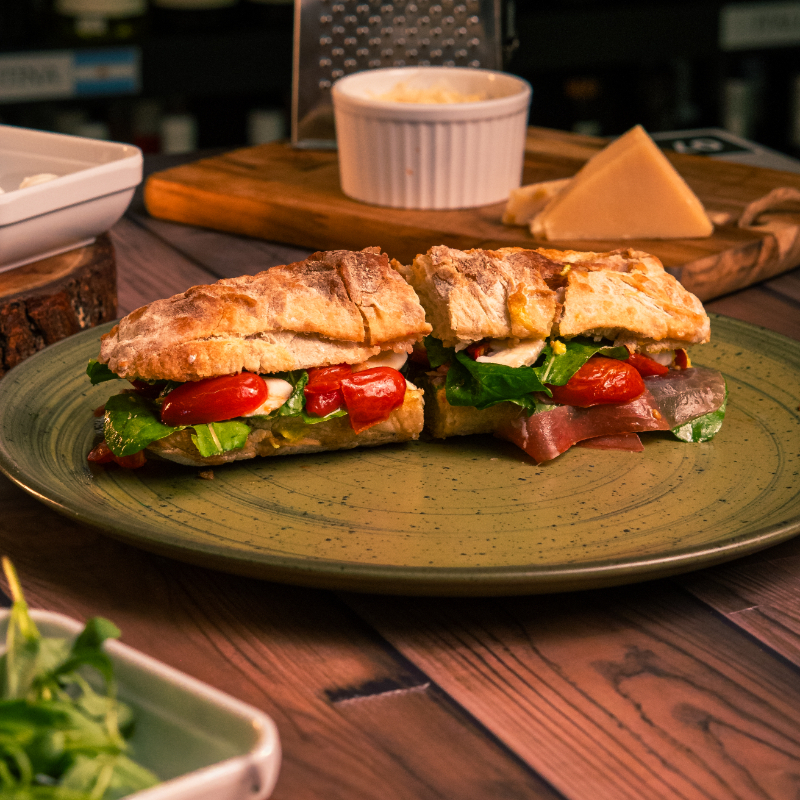 Pão Ciabata, Preseunto parma, Mussarela Bufala, Tomatinho cereja assado, Rúcula, Creme de Abacate.