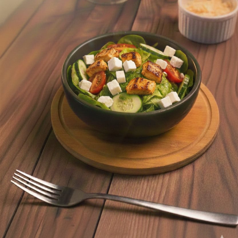 Mix de folhas, Tomates cereja, Pepino Japones, Crotons, Frango em cubos Grelhado, Queijos Provolone. Sal, limão, azeite a parte.