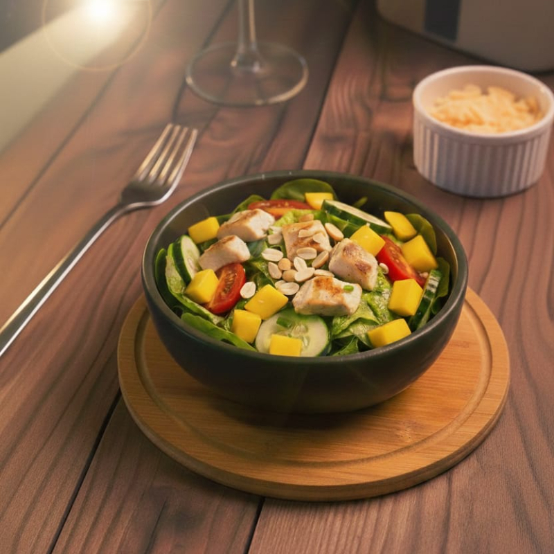 Mix de Folhas, Tomatinho Cereja, Frango grelhado em cubos, Amendoim crocante, Manga em cubos, Crótons, Cenoura Ralada. Sal, Azeite, Limão a parte.