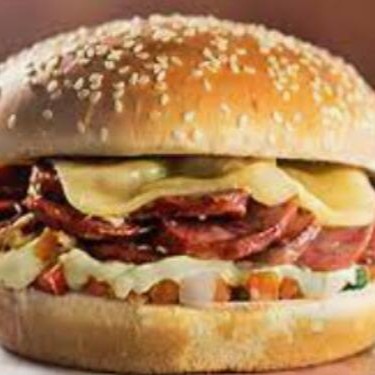 Pão, maionese, hambúrguer, calabresa deliciosa, queijo, presunto, alface e tomate.