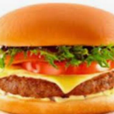 Pão, maionese, hambúrguer suculento, queijo e presunto.