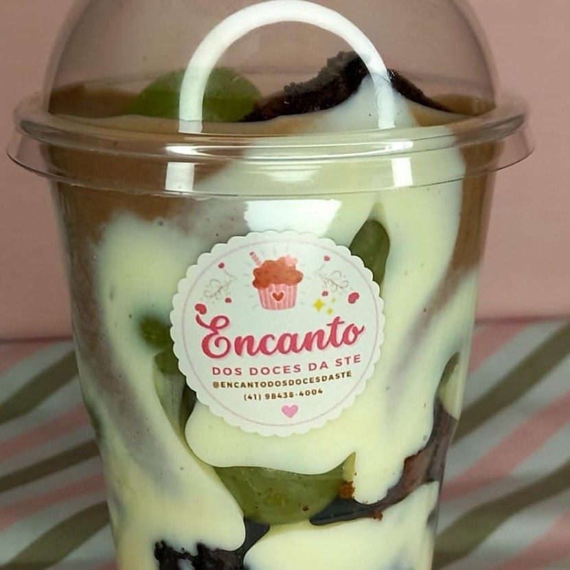 Delicioso copo da felicidade delicia de uvas com creme de chocolate 50%, creme de leite Ninho, pedaços de brownie e uvas verdes sem semente.