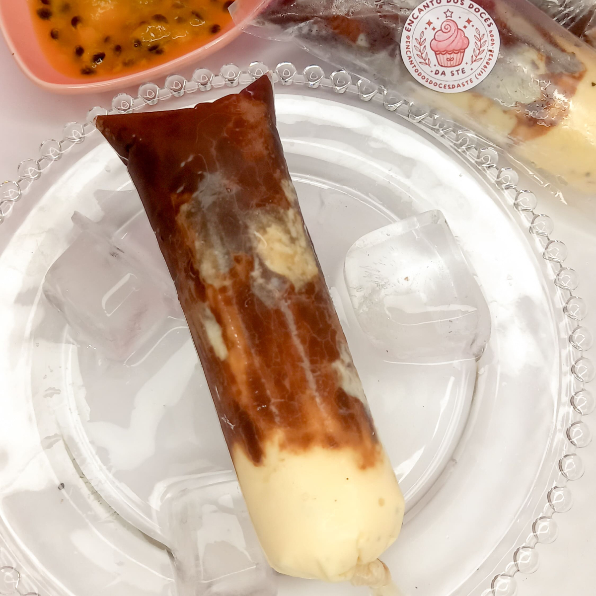 Geladinho de Maracujá Trufado , feito com fruta e casquinha de chocolate meio amargo! Refrescante, cremoso e irresistível