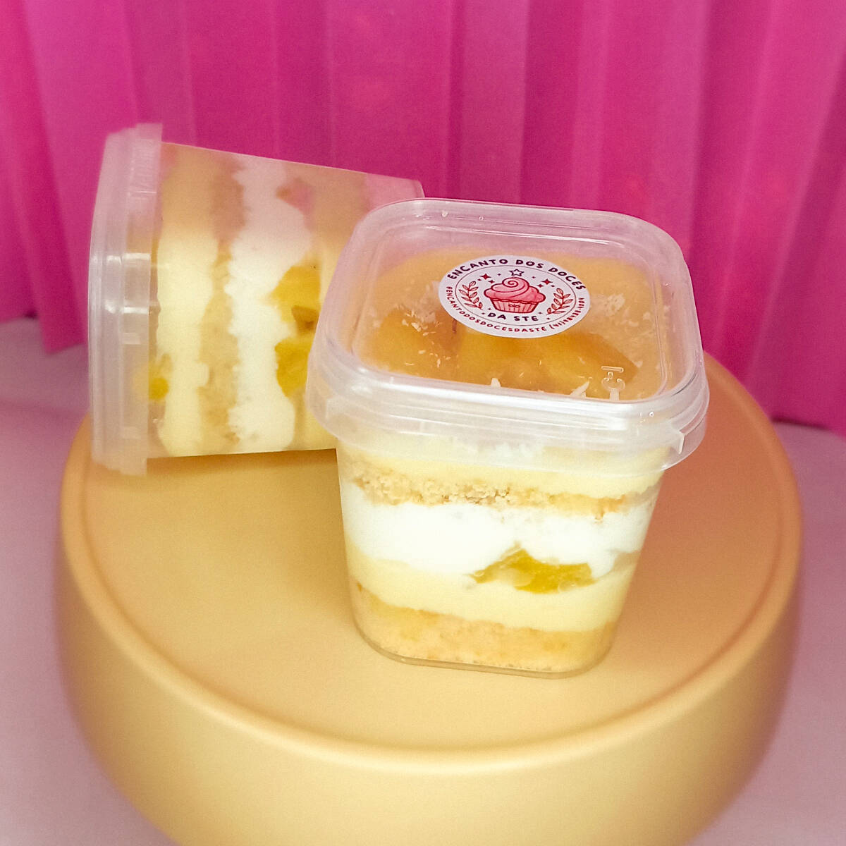 Nosso bolo de pote feito com massa fofinha umedecido com camadas de brigadeiro cremoso de coco, mouse de Ninho e compota de abacaxi, proporcionando um combinação que derrete na boca. Pesa 220g
