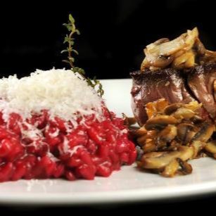 Mignon grelhado com creme de cogumelos paris e risoto cremoso de beterraba com grana padano.